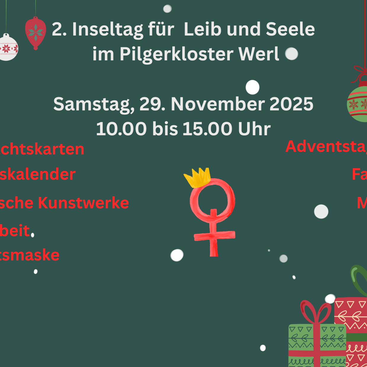 Nach dem erfolgreichen ersten Inseltag letztes Jahr im Herbst , möchten wir Ihnen dieses Mal am 1. Adventswochenende wieder die Gelegenheit geben, sich eine Auszeit zu nehmen, sich etwas Schönes zu gönnen.