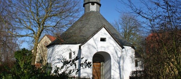 Von außen wirkt die Kapelle recht unauffällig: Ein polygonaler Zentralbau mit zwei sichtbaren Anbauten (Vorhalle und Apsis), abgeschlossen von einem schiefergedeckten Dach, bekrönt von einem kleinen Glockentürmchen.
