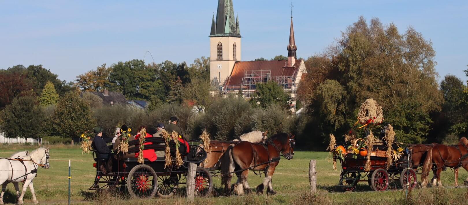 Viele waren gekommen: Zahlreiche Messdiener, zu Fuß und zu Pferde, Fahnenabordnungen der Schützenbruderschaften St. Christophorus Ostinghausen und St. Antonius Bettinghausen, sowie der Kolpingsfamilie der Pfarrei Heilige Familie. Hinzu kamen Musikerinnen und Musiker, die sich eigens für dieses Erntedankfest formiert hatten, die Familien der KiTa-Kinder, zahlreiche Reiterinnen und Reiter unter der Begleitung des Teams der Five-Star-Ranch, sowie fünf Gespanne, die neben Prozessionsteilnehmern auch die festlich geschmückte Erntekrone mitführten.