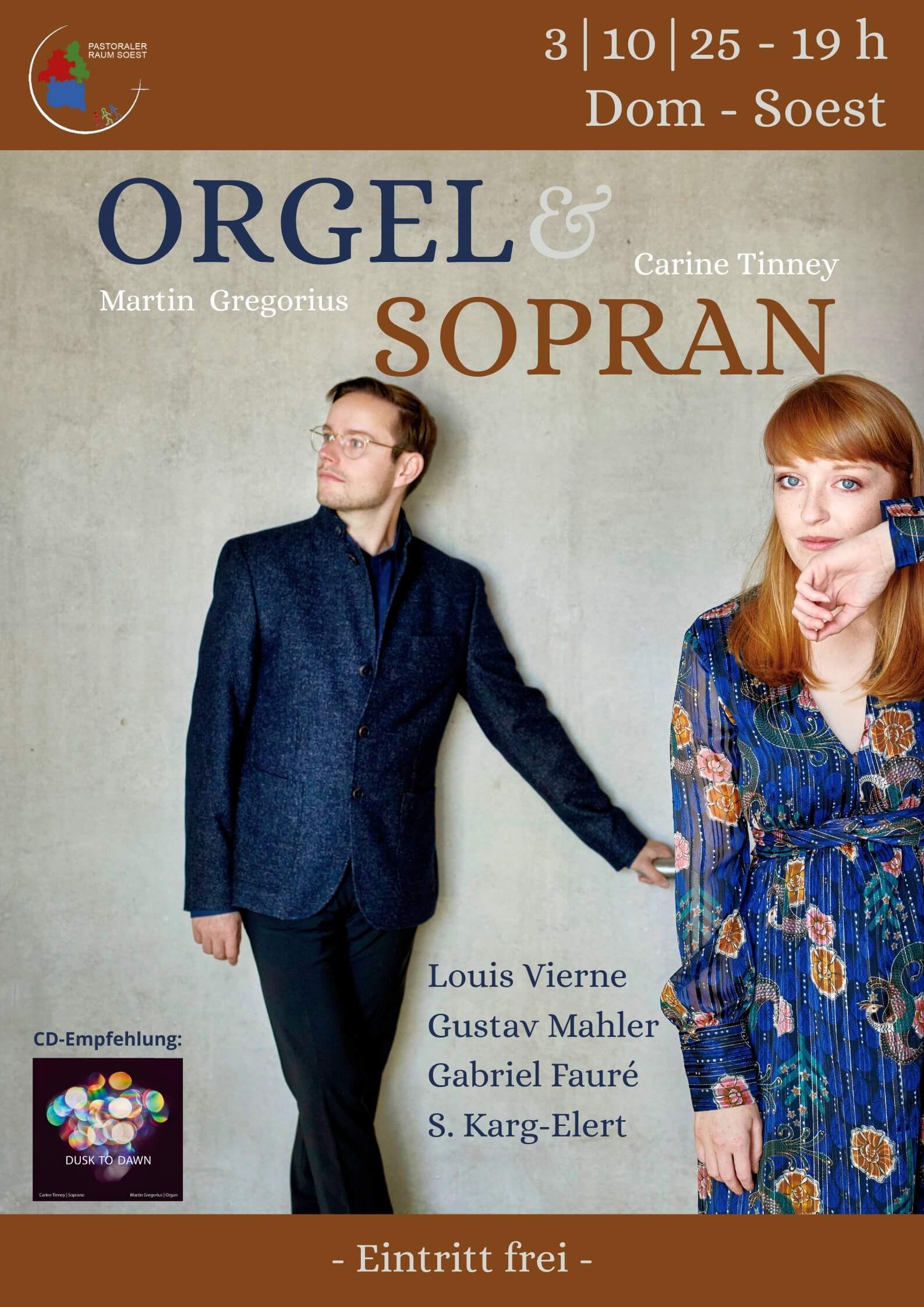 Martin Gregorius (Orgel) und Carine Tinney (Sopran) lassen am Tag der Deutschen Einheit um 19:00 Uhr im St. Patroklidom Louis Vierne, Gustav Mahler, Gabriel Fauré und S. Karg-Elert erklingen. Herzliche Einladung!