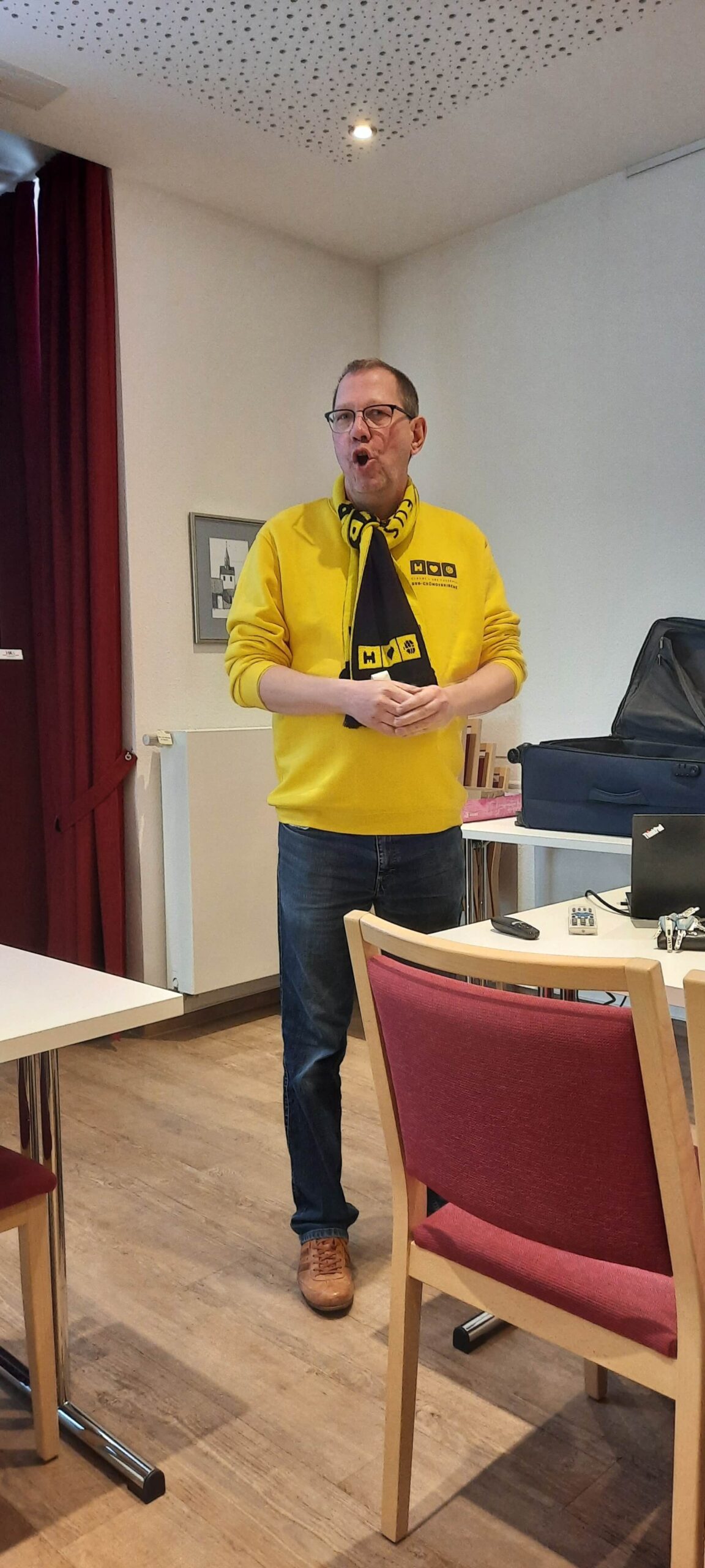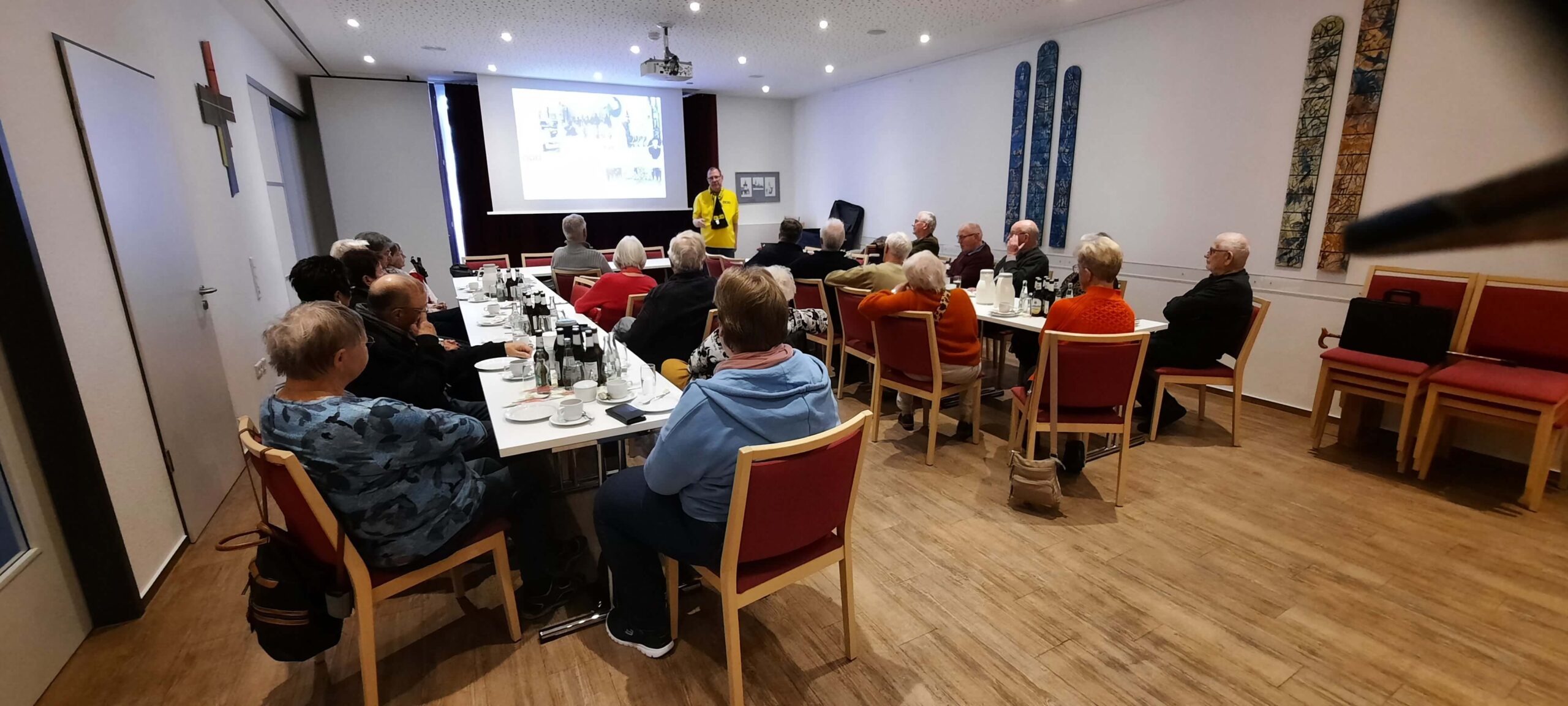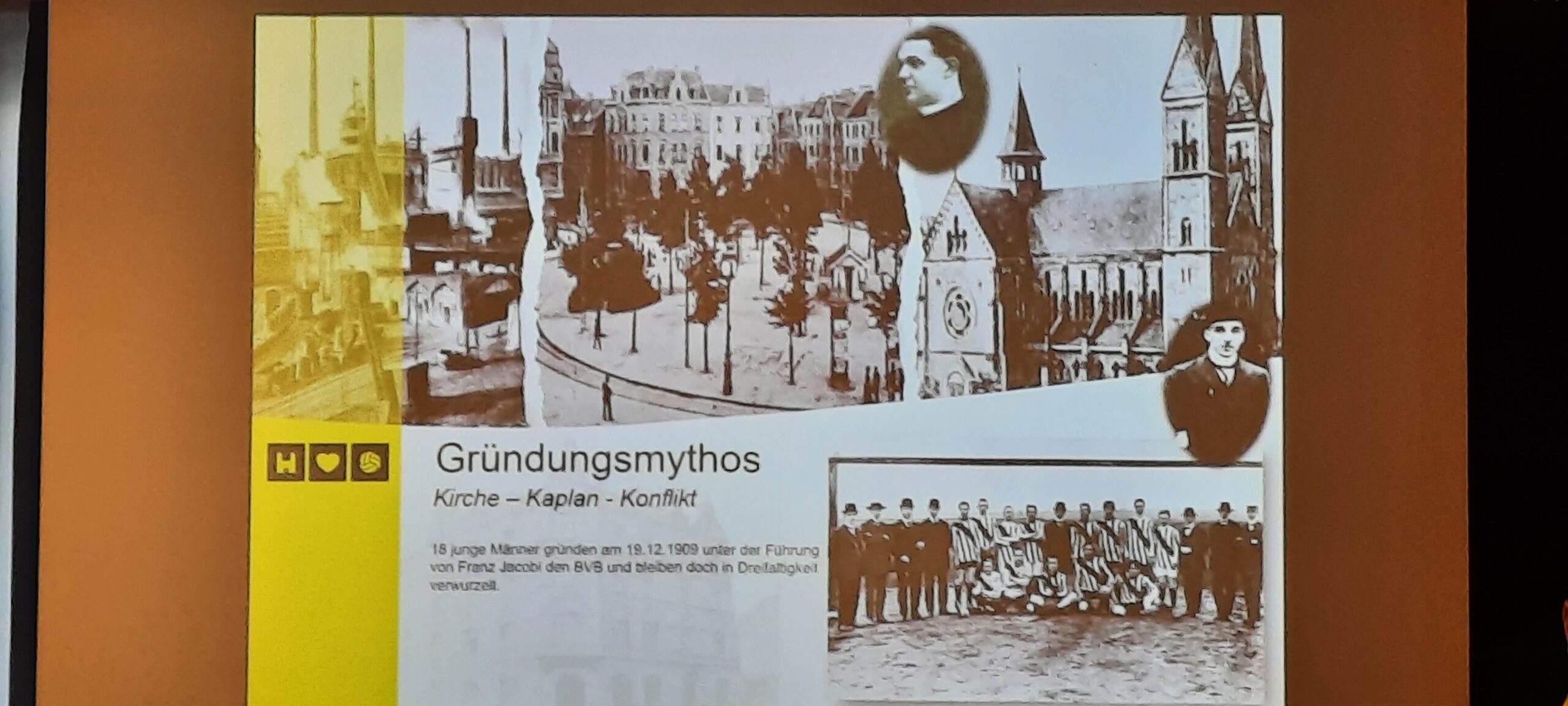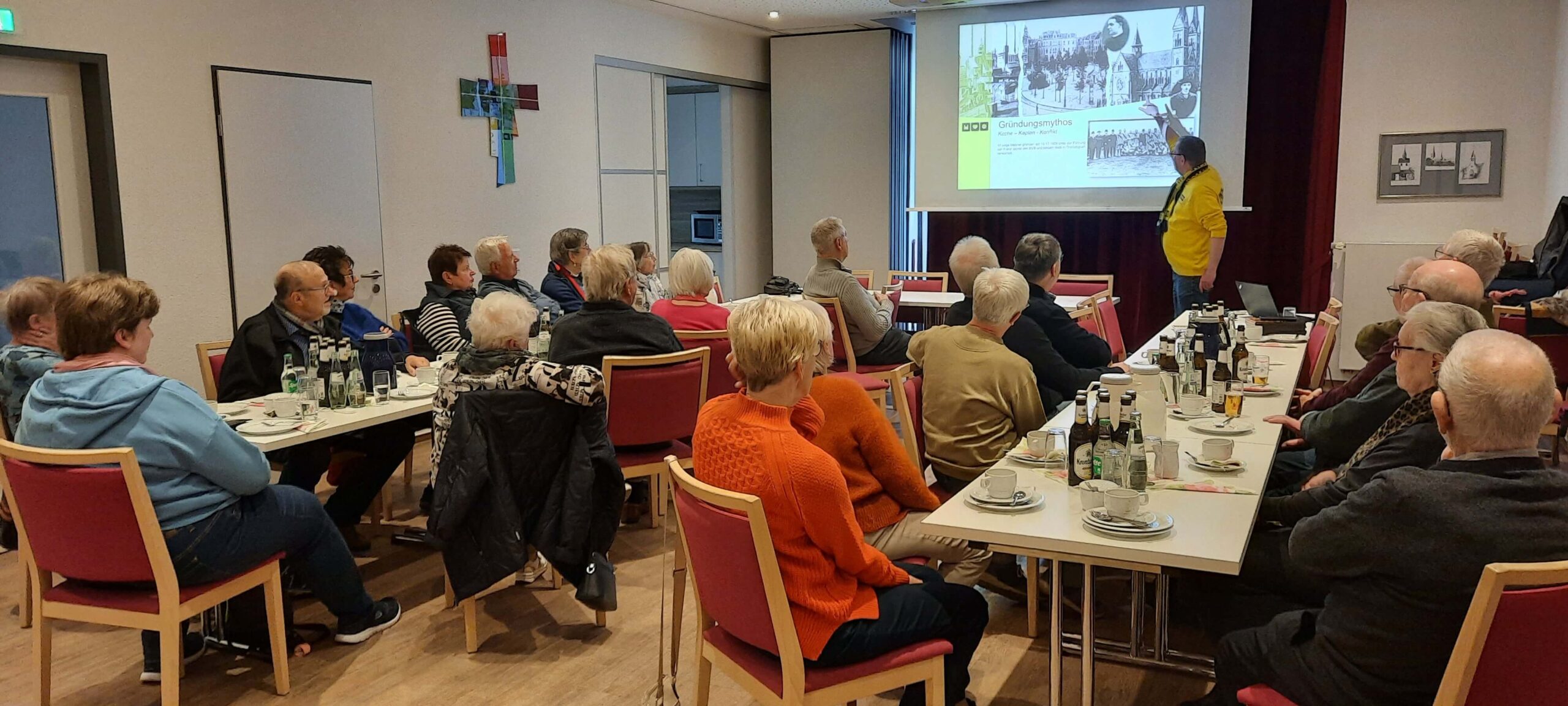 Referent Karsten Haug, Gemeindereferent der Dreifaltigkeitsgemeinde in Dortmund berichtete über die Gründung von Borussia Dortmund im Jahre 1909. Der Verein birgt in sich Geschichte, Leidenschaft und gesellschaftliche Bedeutung. Angefangen hat alles mit dem marianischen Jünglingsverein und dem Streit mit Kaplan Dewald. Er wollte nicht, dass am Sonntag Fußball gespielt werden sollte. Borussia Dortmund musste sich vielen Herausforderungen bis zur Vereinsgründung stellen. Kritik wurde innerhalb der Kirche, der Gesellschaft oder unter den Gründungsmitglieder laut. Weiter ging es in dem Vortrag um die Entwicklung  des Vereins über die Jahrzehnte hinweg – sportlich, kulturell und sozial. Ferner wurde erläutert was wir daraus lernen können über Identität, Gemeinschaft und Wandel? Den Wandel erlebt momentan die Dreifaltigkeit-Gründerkirche im Dortmunder Norden. Sie wird momentan komplett umgebaut. Die Kirche wird in 3 Bereiche aufgeteilt, Sakralraum, Begegnungsstätte und BVB-Museum. Es wird ein Tunnel und eine Tribüne eingebaut. So eine Kirche gibt es auf der ganzen Welt nicht noch einmal. Borussia Dortmund arbeitet eng mit dem Erzbistum Paderborn zusammen.