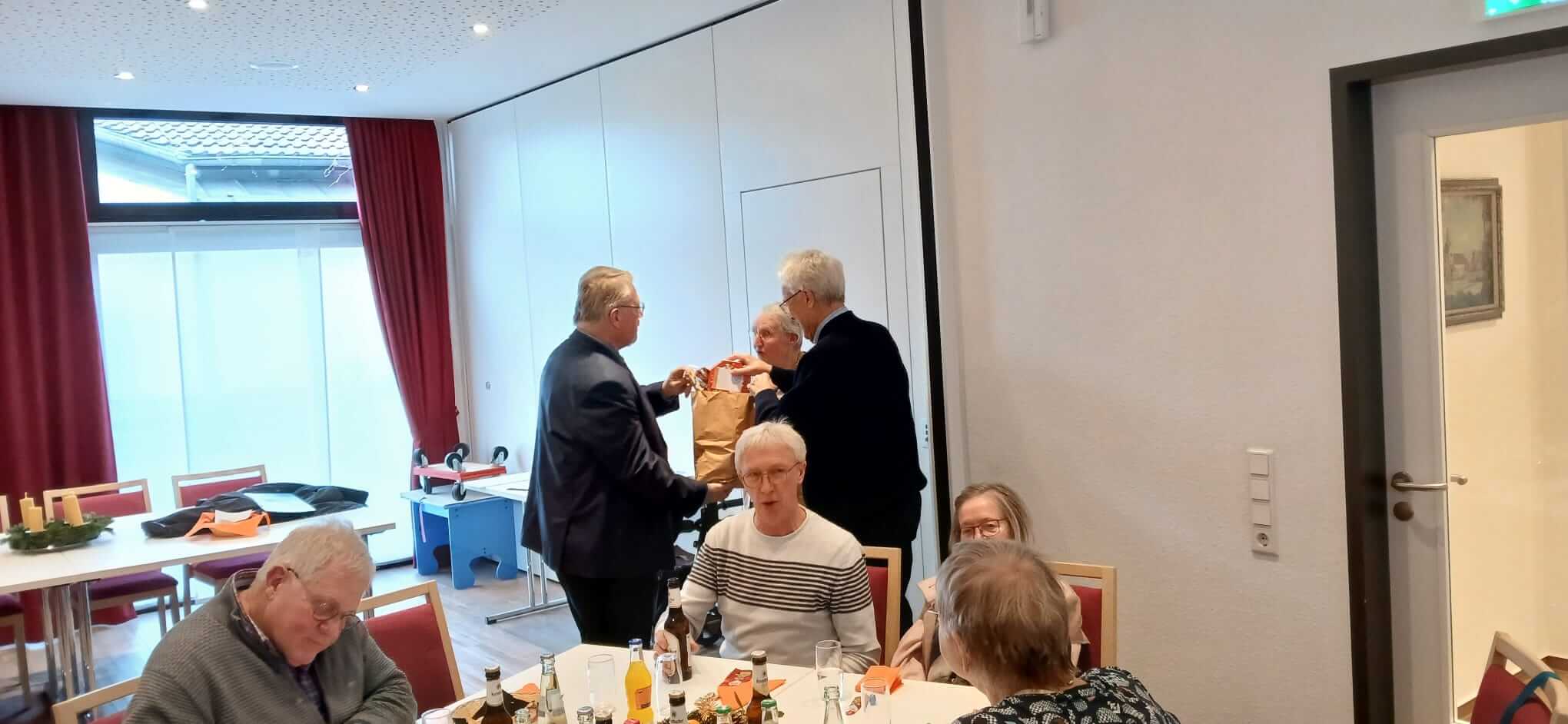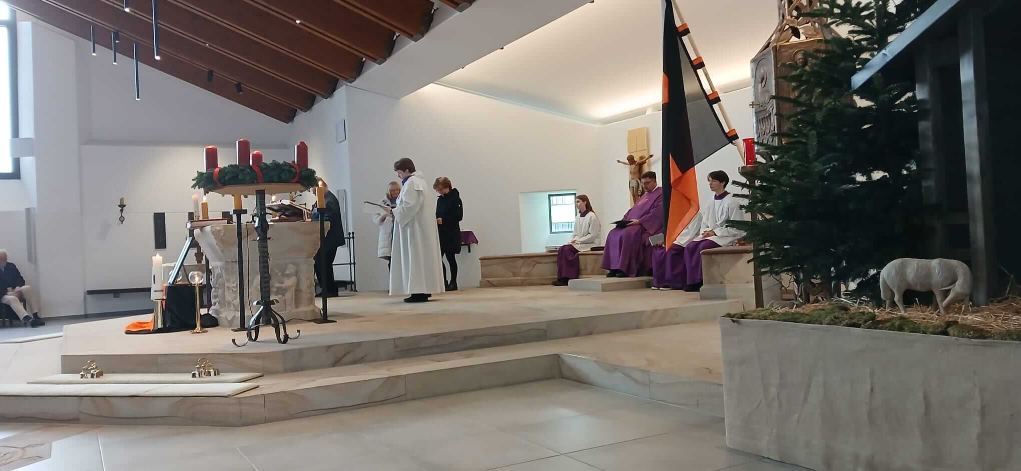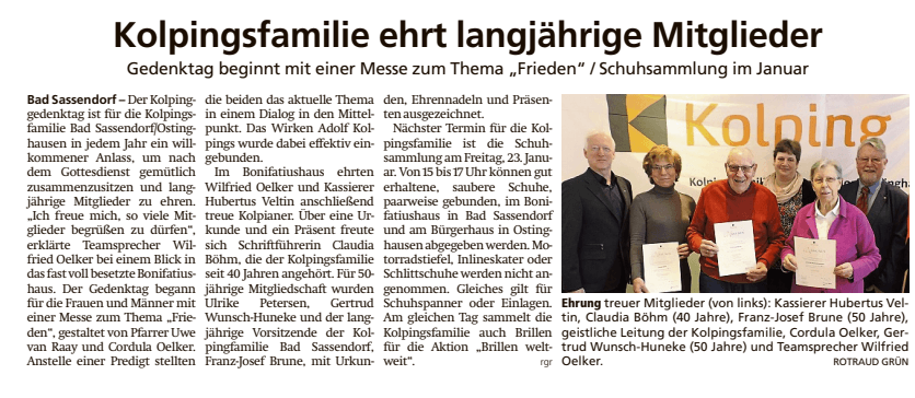 Ehrenpräses Uwe von Raay und die geistliche Leitung Cordula Oelker hatten einen tolle Messe vorbereitet. Die Messe stabd unter dem Thema „Frieden“. Sie fand guten Anklang. Im Anschluss an die Messe ging es ins Boni-Haus. Hier wurden 4 Jubilarehrungen vorgenommen: Claudia Böhm ubd Ulrike Petersen für 40 Jahre Mitgliedschaft sowie Franz-Josef Brune und Gerda Wunsch-Hunecke für 50jährige Mitgliedschaft. Ein kleines Adventprogramm und ein warmer Mittagsimbiss schlossen sich den Ehrungen an. Alle Teilnehmer/innen waren von dem Kolpinggedenktag begeistert.