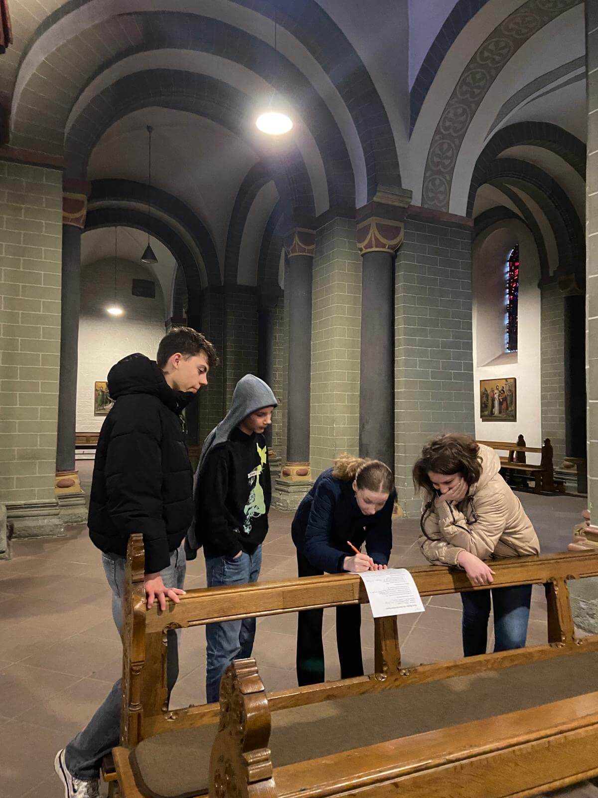 Wir haben gemeinsam in gemischten Kleingruppen eine Entdecker Rallye im Soester Patrokli Dom durchgeführt, wo einige doch bisher ungesehene Wandbilder, Tiere oder Bedeutungen entdeckt haben und auch erst gefunden werden konnten. Es gab vier Teams aus MD, das fünfte Team bestand nur aus Priester Michael Stiehler und Diakon Viktor Schefer, die beide voller Tatendrang die Lösungen suchten und mit ihrem professionellem Hintergrund mit Leichtigkeit die Fragen der Rallye beantworteten, aber die schon gut zusammengetragenen Antworten der Messdienerteams nur teilweise aufwerten konnten.