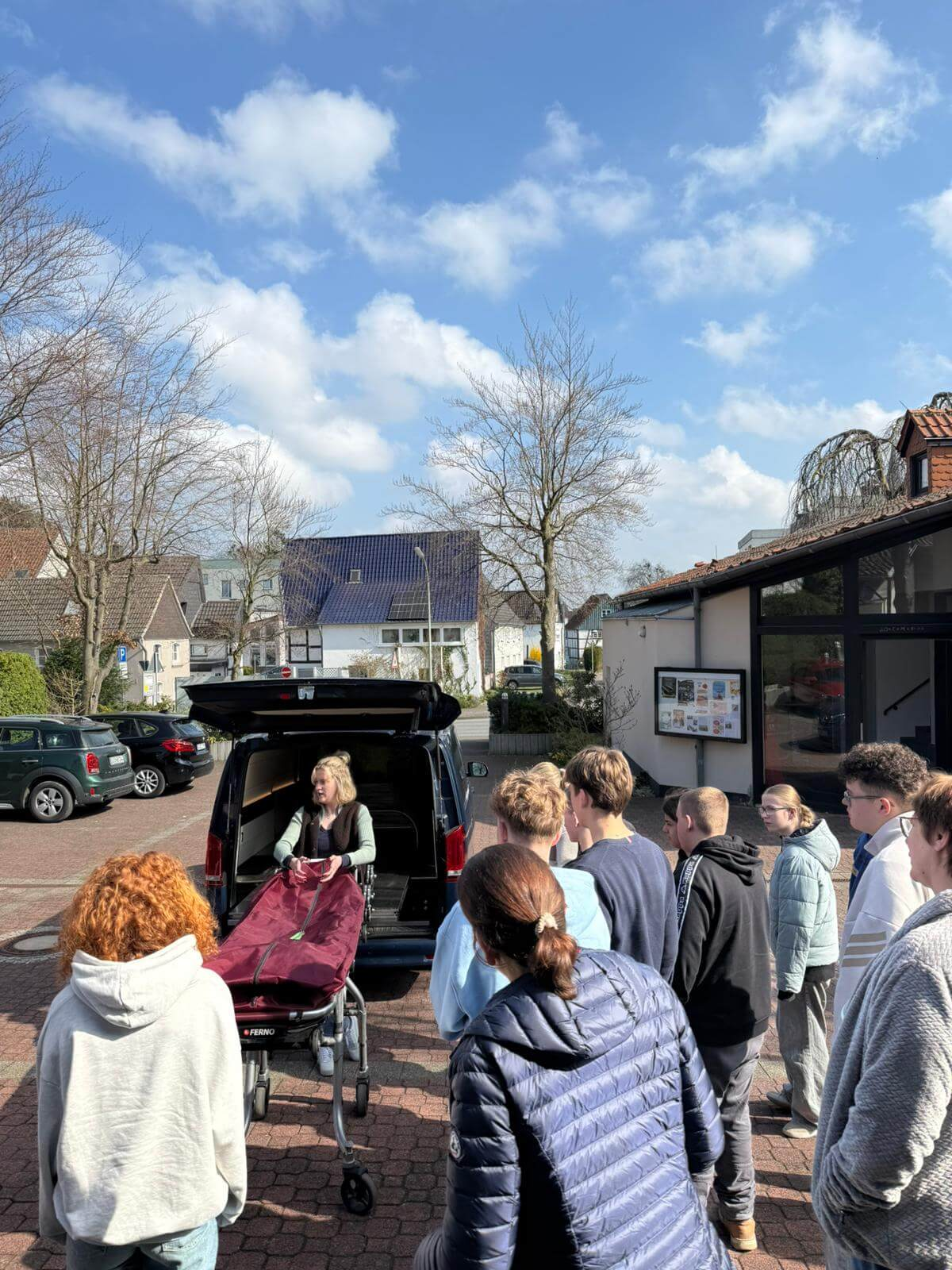 Den Abschluss bildete dann die Bestatterin Pia Böhmer von Wennerbestattungen. Als junge Frau ist sie in einem Beruf tätig, in dem es um die Würde des Menschen nach dessen Tod geht. Pia hat den Jugendlichen sehr persönlich einen Eindruck in ihre Arbeit, die manchmal sehr herausfordernd ist, gegeben. Danach wurde es dann praktisch, als sie das Bestattungsauto gezeigt und erklärt hat.