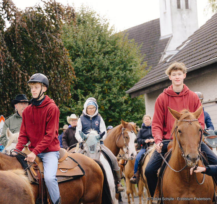 Ostinghausen im Kreis Soest. Ein Dorf mit Fußballverein, Schützenfest, Kirche und Pferde-Ranch. Hier ist der 17-Jährige in die Welt des Glaubens und der Pferde reingewachsen. Ein guter Moment, um über beide Facetten seines Lebens zu sprechen, bietet sich Anfang Oktober. Maximilian reitet auf Luna mit bei einer Pferdeprozession des Pastoralen Raums Soest.