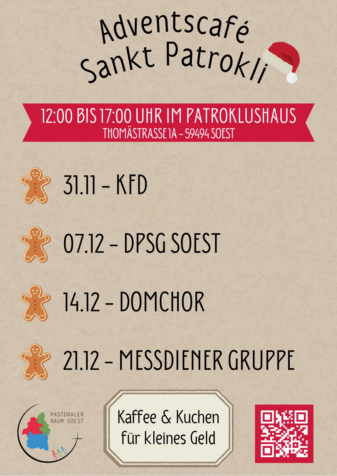 Auch in diesem Jahr findet an den vier Adventssonntagen in Sankt Patrokli das Adventscafe´ statt. Hierzu laden die KFD, die DPSG Soest, der Patrokli Domchor und die Messdienergruppe sonntags nach der Messe ab 12 Uhr alle herzlich in den Groppersaal des Patroklushauses ein, bei einem Stück Torte und einer Tasse Kaffee in gemütlicher Atmosphäre zusammen zu kommen.