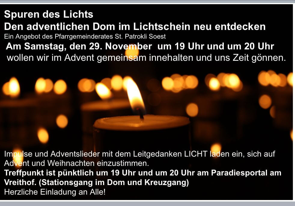 Am 29. November lädt der Pfarrgemeinderat St. Patrokli sehr herzlich zu Impulsen und Liedern unter dem Leitgedanken LICHT in den Patroklidom ein.