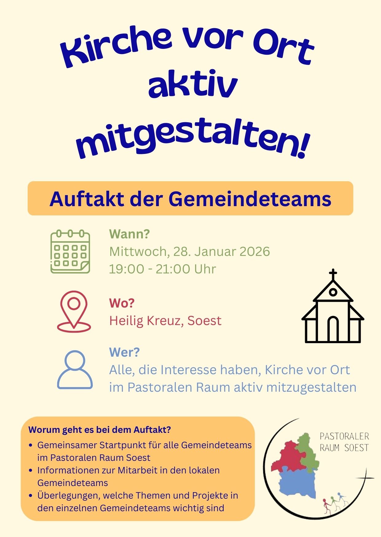 Als gemeinsamer Startpunkt für alle Gemeindeteams im Pastoralen Raum findet am Mittwoch, 28. Januar, ab 19 Uhr in Heilig Kreuz Soest eine Auftaktveranstaltung statt.
