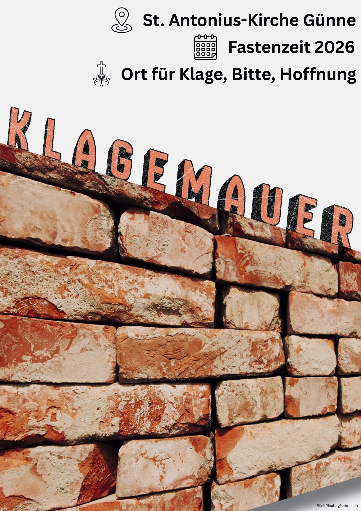 An der Klagemauer, die mit dem ersten Fastensonntag im hinteren Kirchenraum der St. Antonius-Kirche aufgebaut ist, haben alle Kirchenbesucher die Möglichkeit, ganz nach dem Vorbild der Klagemauer in Jerusalem, in einem Moment der Ruhe sich ihre Last und persönlichen Anliegen von der Seele zu schreiben. Kinder sind eingeladen, Bilder zu malen. Die Zettel können in die Mauerritzen gesteckt werden. Gerne kann auch eine Kerze entzündet werden.