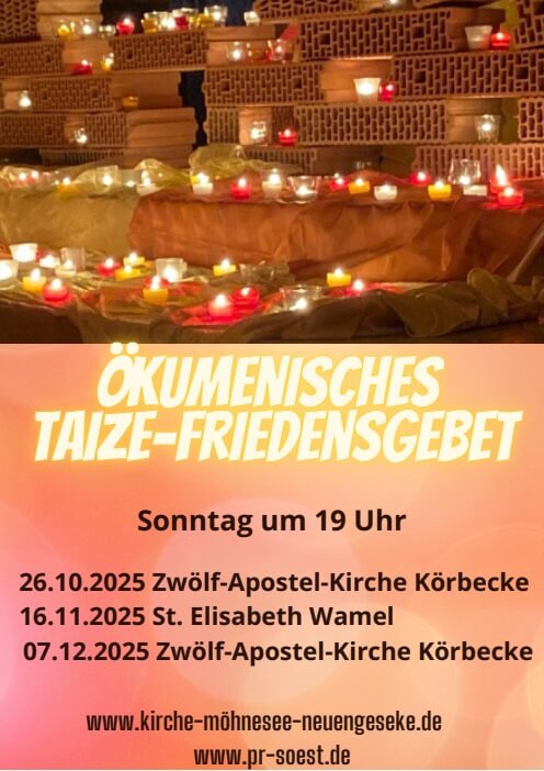 Am Sonntag, 26.10.2025 findet das Ökumenische Taizé-Friedensgebet in der 12 Apostel Kirche in Körbecke,