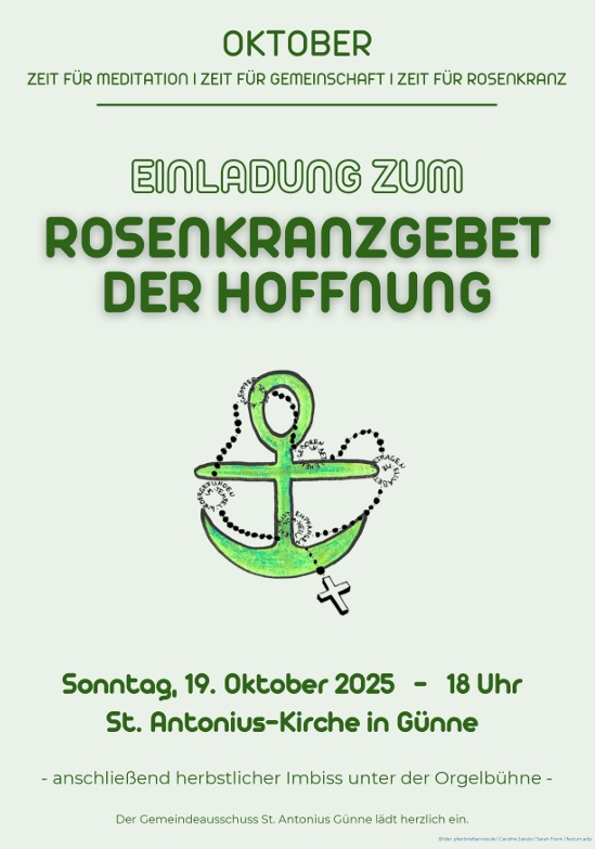 Das Gebet findet am Sonntag, 19. Oktober 2025 um 18:00 Uhr in der St. Antonius-Kirche in Günne statt. Im Anschluss treffen sich alle Teilnehmer zum Beisammensein bei einem herbstlichen Imbiss unter der Orgelbühne.