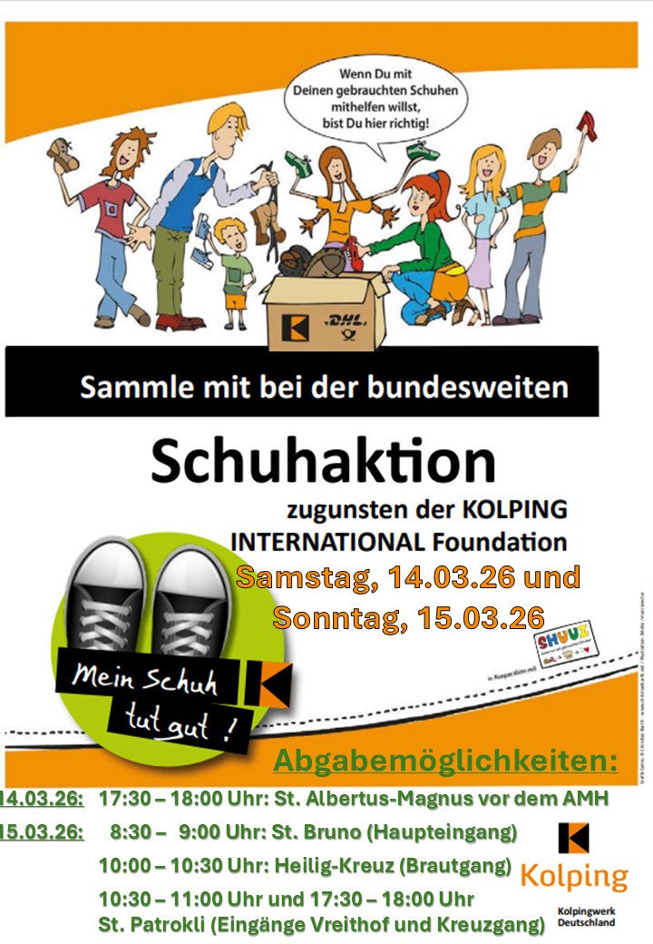 Gebrauchte, gut erhaltene Schuhe können – paarweise verbunden – jeweils eine halbe Stunde vor den Sonntagsgottesdiensten an den Türen der katholischen Kirchen abgegeben werden. Mitglieder der Kolpingsfamilie Soest stehen bereit, um die Schuhspenden entgegenzunehmen.